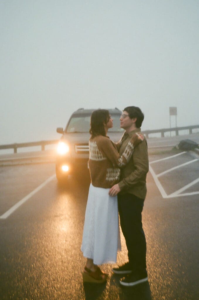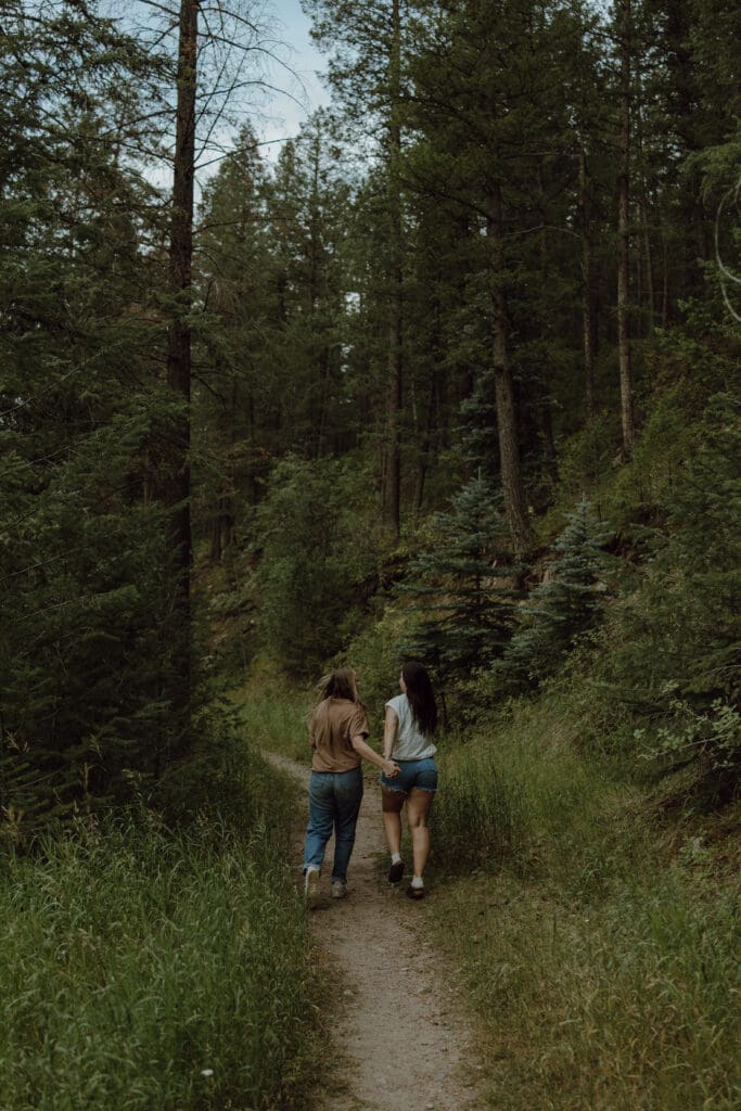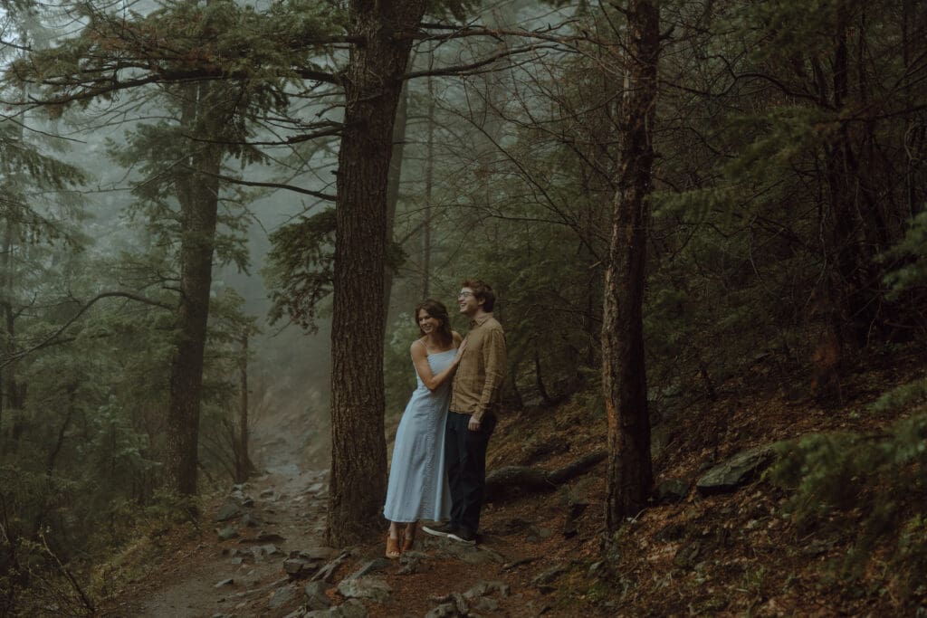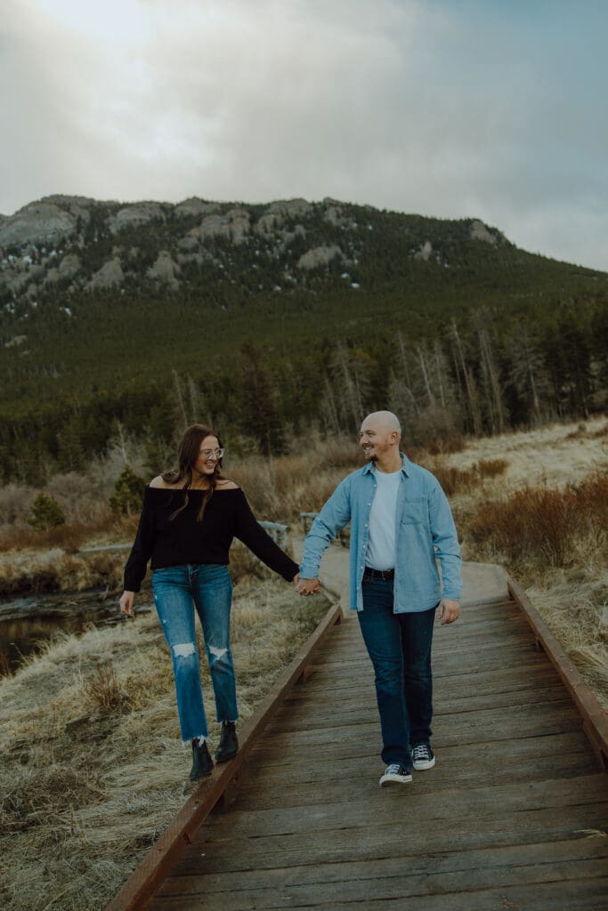 One of my all time favorite locations to take engagement photos is a small trail that starts just down the road from the Evergreen Lake House. With easy parking at both the Evergreen Golf Course and pull offs on the side of the road it’s one of the best places to have forest photos without having to hike! Pros of these spots include the variety of different vibes, you can be lake front at the lake house or take a walk and be right by the river surrounded by beautiful pine trees, the trail is a very private spot, and its beautiful year round! The con is that the lake house can be closed occasionally for weddings!